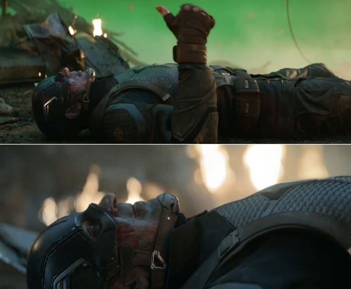 22. 쓰러진 캡틴 아메리카가 사실은 '엄지척'을 하고 있음