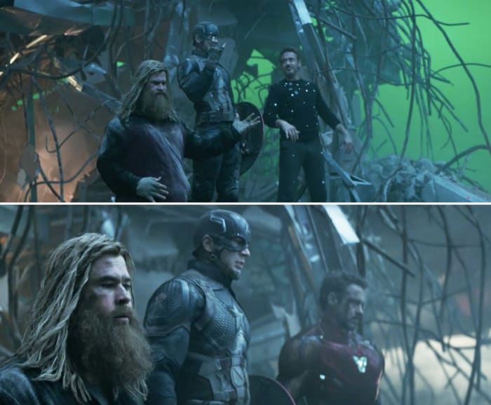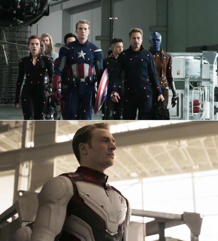 21. 시간 여행을 위한 '팀 슈트'를 입고 슬로우모션으로 걸어가는 모습을 촬영중인 어벤져스 멤버들 (팀 슈트가 전부 CG 였다니)